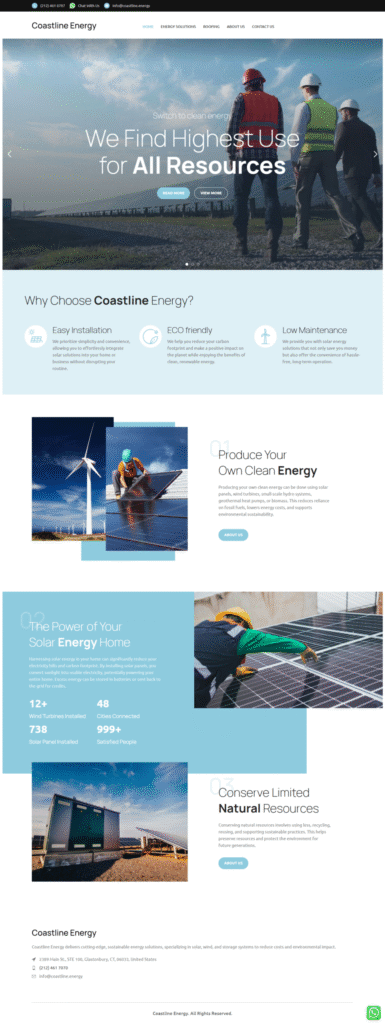 The website features a clean UI/UX design, fully responsive layout, and optimized performance across all devices. Special focus was placed on speed optimization, SEO best practices, and user journey mapping to ensure maximum visibility and engagement. The site structure was crafted to highlight Coastline Energy’s expertise, simplify navigation, and guide visitors toward key actions.